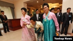 获准参与家庭团聚的朝鲜人到达现场(韩联社)