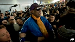 前美国篮球明星罗德曼和一组退役的NBA球员抵达北京,此前他们访问了朝鲜,并于星期三晚上为庆祝朝鲜领导人金正恩的生日而打了一场表演赛。